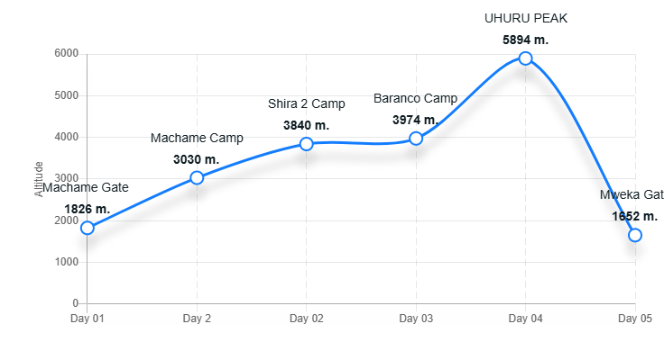 • Summit at Uhuru Peak: Reach the iconic summit of Mount Kilimanjaro (5,895m), the highest point in Africa, and enjoy panoramic views of the surrounding landscape.