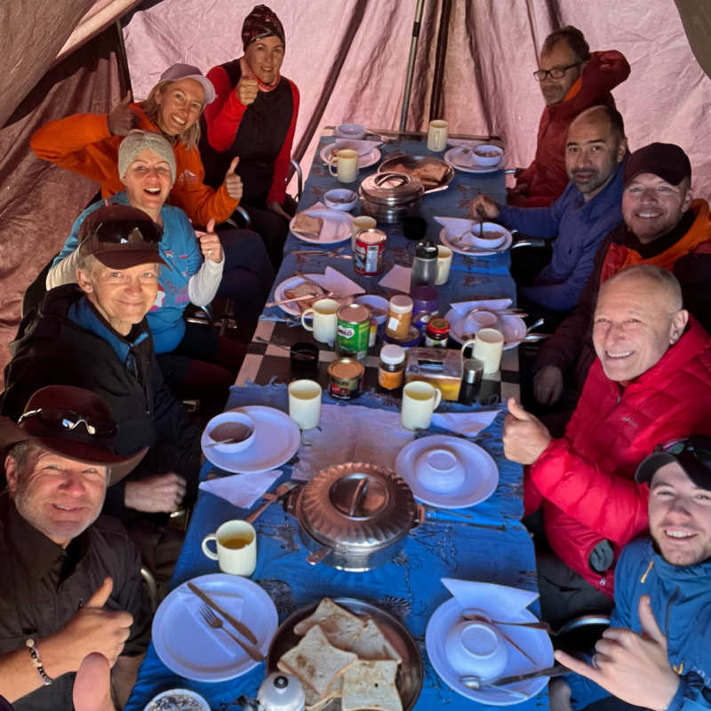 Highly-trained chefs prepare three hot nutritious meals daily, as well as trail snacks and afternoon tea each day. You’ll eat all your meals in a solar-lit dining tent with your fellow trekkers and head guide. Delicious vegetarian, vegan, gluten-free and other specialty meals can be provided (with advance request). We’re happy to send you a sample menu—just ask!